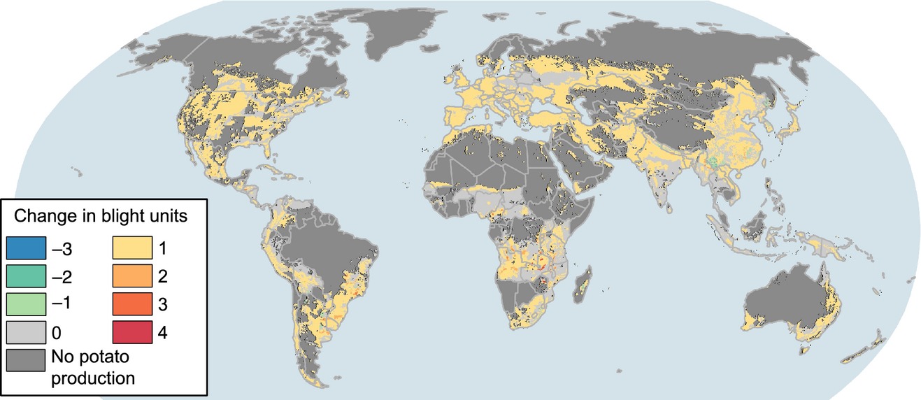 Climate change may have limited effect on global risk of potato late blight. Global Change Biology. 20:3621–3631.