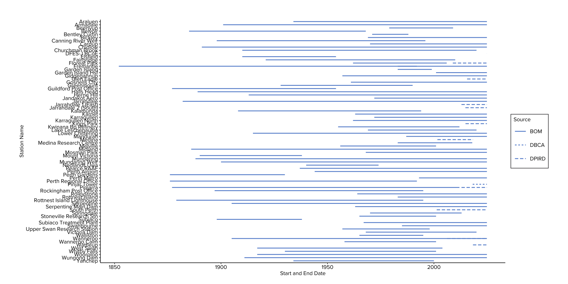 # provide some standard names between DPIRD and SILO for easy merging where# data values are shared# not all columns are renamed, but almost all are listed for clarity data.table::setnames( out,old =c("station_code","station_name","year","month","day","date","air_temperature_avg","air_temperature_max","air_temperature_max_time","air_temperature_min","air_temperature_min_time","apparent_air_temperature_avg","apparent_air_temperature_max","apparent_air_temperature_max_time","apparent_air_temperature_min","apparent_air_temperature_min_time","barometric_pressure","battery_min_voltage","battery_min_voltage_date_time","chill_hours","delta_t_avg","delta_t_max","delta_t_max_time","delta_t_min","delta_t_min_time","dew_point_avg","dew_point_max","dew_point_max_time","dew_point_min","dew_point_min_time","erosion_condition_minutes","erosion_condition_start_time","errors","evapotranspiration","evapotranspiration_short_crop","evapotranspiration_tall_crop","frost_condition_minutes","frost_condition_start_time","heat_condition_minutes","heat_condition_start_time","observations_count","observations_percentage","pan_evaporation","pan_evaporation_12am","rainfall","relative_humidity_avg","relative_humidity_max","relative_humidity_max_time","relative_humidity_min","relative_humidity_min_time","richardson_units","soil_temperature","solar_exposure","wet_bulb_avg","wet_bulb_max","wet_bulb_max_time","wet_bulb_min","wet_bulb_min_time","wind_avg_speed","wind_height","wind_max_direction_compass_point","wind_max_direction_degrees","wind_max_speed","wind_max_time" ),new =c("station_code","station_name","year","month","day","date","air_tavg","air_tmax","air_tmax_time","air_tmin","air_tmin_time","apparent_air_tavg","apparent_air_tmax","apparent_air_tmax_time","apparent_air_tmin","apparent_air_tmin_time","barometric_pressure","battery_min_voltage","battery_min_voltage_date_time","chill_hours","delta_tavg","delta_tmax","delta_tmax_time","delta_tmin","delta_tmin_time","dew_point_avg","dew_point_max","dew_point_max_time","dew_point_min","dew_point_min_time","erosion_condition_minutes","erosion_condition_start_time","errors","et","et_short_crop","et_tall_crop","frost_condition_minutes","frost_condition_start_time","heat_condition_minutes","heat_condition_start_time","observations_count","observations_percentage","pan_evaporation","pan_evaporation_12am","rainfall","rh_avg","rh_tmax","rh_tmax_time","rh_tmin","rh_tmin_time","richardson_units","soil_temperature","radiation","wet_bulb_avg","wet_bulb_tmax","wet_bulb_tmax_time","wet_bulb_tmin","wet_bulb_tmin_time","wind_avg_speed","wind_height","wind_max_direction_compass_point","wind_max_direction_degrees","wind_max_speed","wind_max_time" ),skip_absent =TRUE )