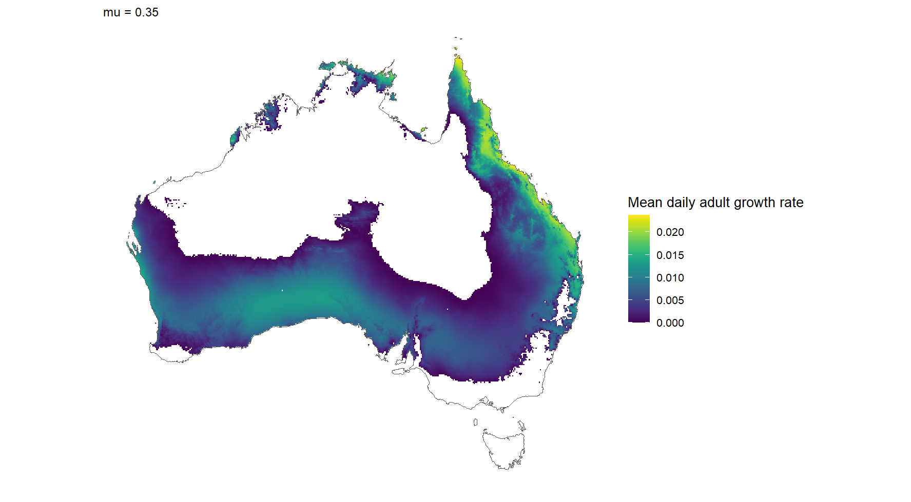 Model output of the posibility of Polyphagous Shothole Borer (PSHB) becoming established. The white areas of Australia indicate that the model suggests that this insect cannot become established. Courtesy Prof. Ben Phillips, Curtin University (unpublished).