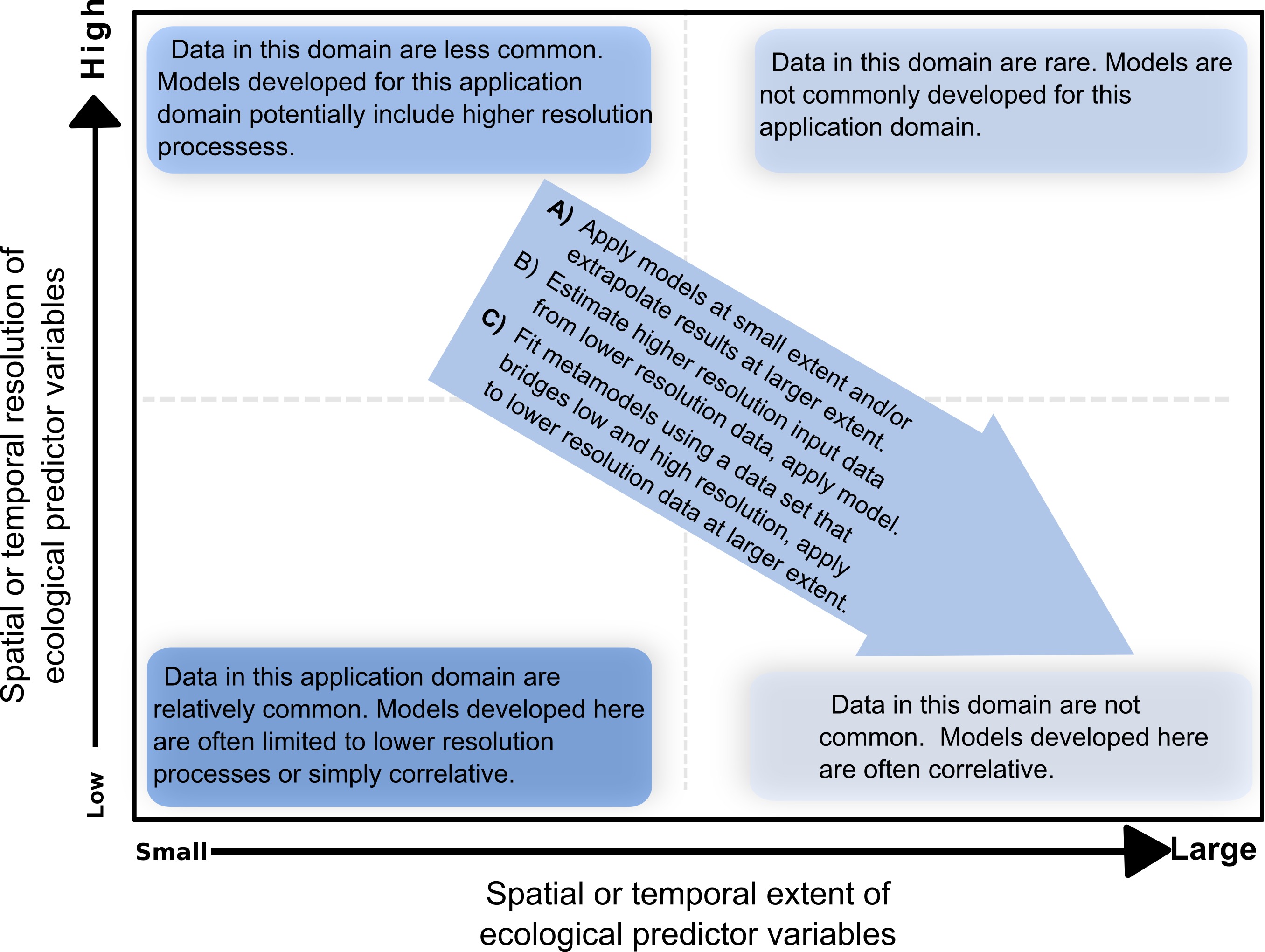 Ecological modeling has most commonly been based on data from a small spatial or temporal extent and low level of spatial or temporal resolution. When higher resolution data are available, this often makes it possible to develop process-based models, even for high resolution processes such as microbial and arthropod community interactions and ecophysiological processes. Such models can be used, in turn, to create metamodels that do not require as high a level of resolution for input data, and can thus potentially be applied across greater extents. Figure 1 from A. Sparks et al. (2011)